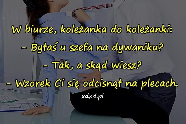 W biurze, koleżanka do koleżanki: – Byłaś u szefa na dywaniku? – Tak, a skąd wiesz? – Wzorek Ci się odcisnął na plecach.