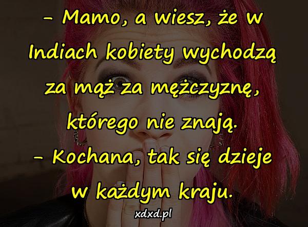 – Mamo, a wiesz, że w Indiach kobiety wychodzą za mąż za mężczyznę, którego nie znają. – Kochana, tak się dzieje w każdym kraju.