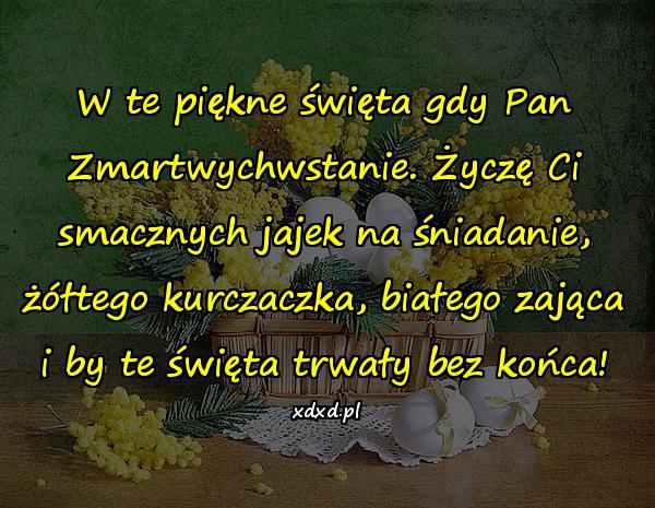 W te piękne święta gdy Pan Zmartwychwstanie. Życzę Ci smacznych jajek na śniadanie, żółtego kurczaczka, białego zająca i by te święta trwały bez końca!