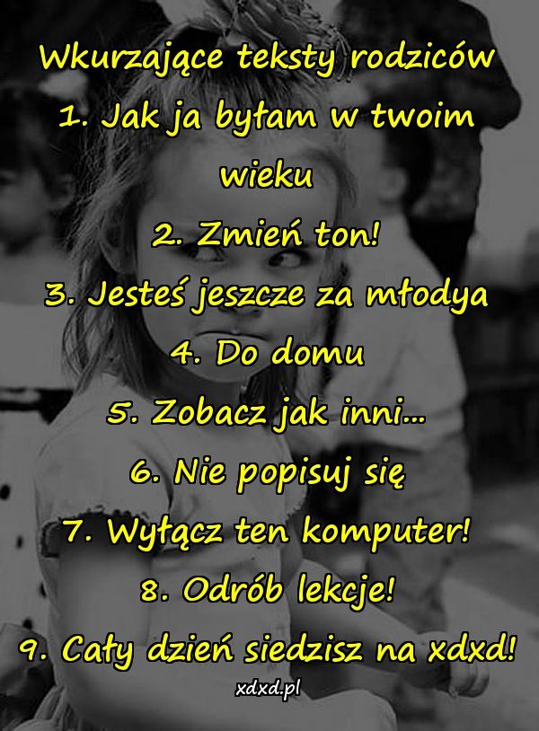 Wkurzające teksty rodziców 1. Jak ja byłam w twoim wieku 2. Zmień ton! 3. Jesteś jeszcze za młodya 4. Do domu 5. Zobacz jak inni… 6. Nie popisuj się 7. Wyłącz ten komputer! 8. Odrób lekcje! 9. Cały dzień siedzisz na xdxd!