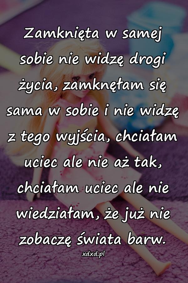 Zamknięta w samej sobie nie widzę drogi życia, zamknęłam się sama w sobie i nie widzę z tego wyjścia, chciałam uciec ale nie aż tak, chciałam uciec ale nie wiedziałam, że już nie zobaczę świata barw.