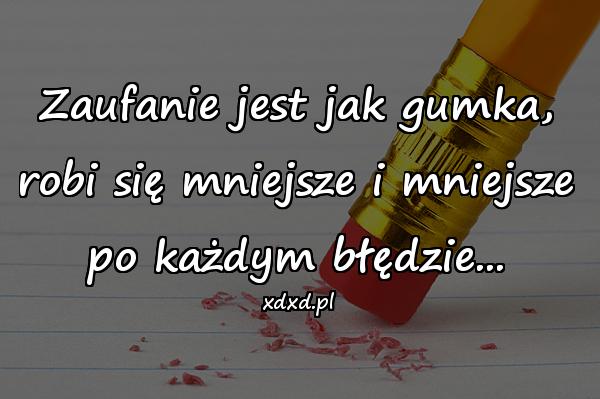 Home Cytaty Cytaty o życiu Zaufanie jest jak gumka 2 lata ago 2 lata ago Cytaty o życiu Zaufanie jest jak gumka autor: admin 10wyświetleń 814 814 points Zaufanie jest jak gumka, robi się mniejsze i mniejsze po każdym błędzie… Pobierz obrazek Post PaginationPoprzedniPreviousNastępnyNext aforyzmy, besty, cytat, cytaty, cytaty o życiu, gumka, lovsy, mem, memy, obrazki, sentencje, te myśli, zaufanie, życie Twoja reakcja? zmieszany 0 zmieszany porażka 0 porażka zabawne 0 zabawne zły 0 zły miłośc 0 miłośc fajne 0 fajne lol 0 lol omg 0 omg 0 komentarzy Anuluj pisanie odpowiedziTwój adres e-mail nie zostanie opublikowany. Wymagane pola są oznaczone * Zapamiętaj moje dane w tej przeglądarce podczas pisania kolejnych komentarzy.