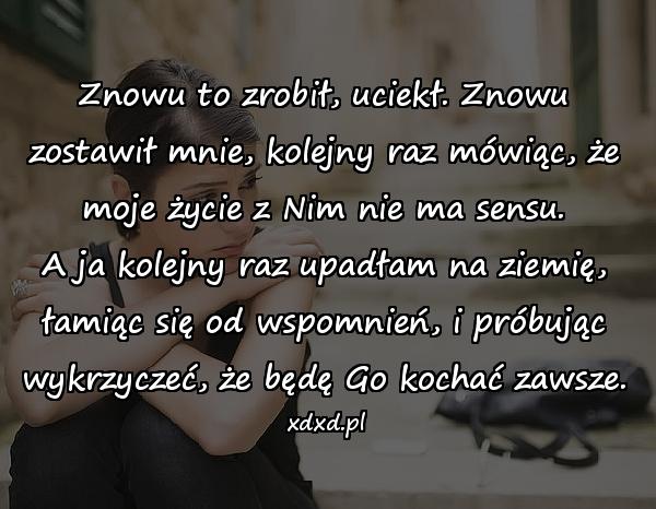 Znowu to zrobił, uciekł. Znowu zostawił mnie, kolejny raz mówiąc, że moje życie z Nim nie ma sensu. A ja kolejny raz upadłam na ziemię, łamiąc się od wspomnień, i próbując wykrzyczeć, że będę Go kochać zawsze.