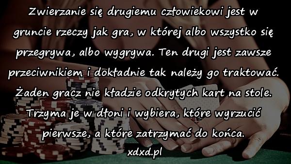 Zwierzanie się drugiemu człowiekowi jest w gruncie rzeczy jak gra, w której albo wszystko się przegrywa, albo wygrywa. Ten drugi jest zawsze przeciwnikiem i dokładnie tak należy go traktować. Żaden gracz nie kładzie odkrytych kart na stole. Trzyma je w dłoni i wybiera, które wyrzucić pierwsze, a które zatrzymać do końca.