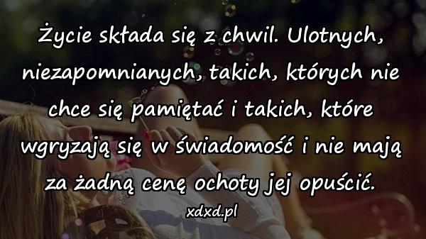 Życie składa się z chwil. Ulotnych, niezapomnianych, takich, których nie chce się pamiętać i takich, które wgryzają się w świadomość i nie mają za żadną cenę ochoty jej opuścić.