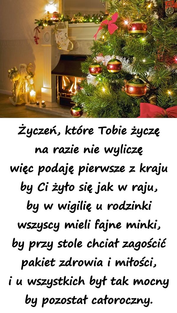 Życzeń, które Tobie życzę na razie nie wyliczę więc podaję pierwsze z kraju by Ci żyło się jak w raju, by w wigilię u rodzinki wszyscy mieli fajne minki, by przy stole chciał zagościć pakiet zdrowia i miłości, i u wszystkich był tak mocny by pozostał całoroczny.