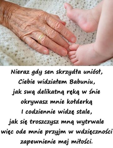 Nieraz gdy sen skrzydła uniósł, Ciebie widziałem Babuniu, jak swą delikatną ręką w śnie okrywasz mnie kołderką I codziennie widzę stale, jak się troszczysz mną...