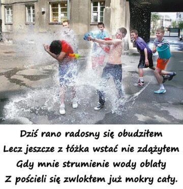 Dziś rano radosny się obudziłem Lecz jeszcze z łóżka wstać nie zdążyłem Gdy mnie strumienie wody oblały Z pościeli się zwlokłem już mokry cały.