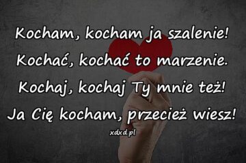 Kocham, kocham ja szalenie! Kochać, kochać to marzenie. Kochaj, kochaj Ty mnie też! Ja Cię kocham, przecież wiesz!