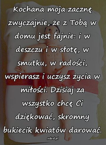 Kochana moja zacznę zwyczajnie, że z Tobą w domu jest fajnie: i w deszczu i w słotę, w smutku, w radości, wspierasz i uczysz życia...
