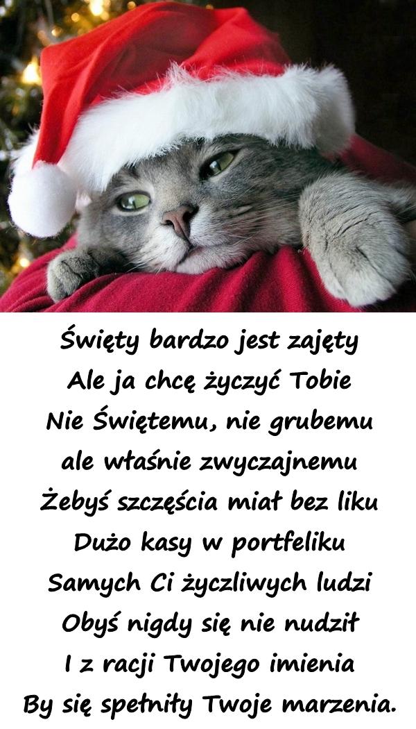 Święty bardzo jest zajęty Ale ja chcę życzyć Tobie Nie Świętemu, nie grubemu ale właśnie zwyczajnemu Żebyś szczęścia miał bez liku Dużo kasy w portfeliku Samych Ci życzliwych ludzi Obyś nigdy się nie nudził I z racji Twojego imienia By się spełniły Twoje marzenia.