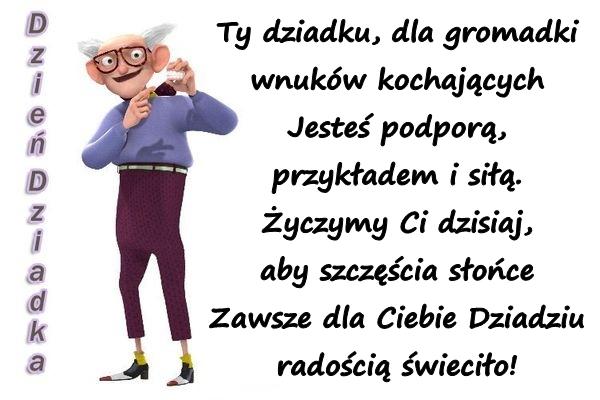 Ty dziadku, dla gromadki wnuków kochających Jesteś podporą,przykładem i siłą. Życzymy Ci dzisiaj, aby szczęścia słońce Zawsze dla Ciebie Dziadziu radością świeciło!