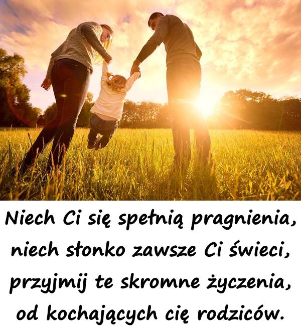 Niech Ci się spełnią pragnienia, niech słonko zawsze Ci świeci, przyjmij te skromne życzenia, od kochających cię rodziców.
