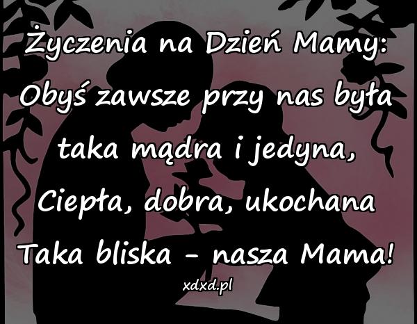Życzenia na Dzień Mamy: Obyś zawsze przy nas była taka mądra i jedyna, Ciepła, dobra, ukochana Taka bliska – nasza Mama!