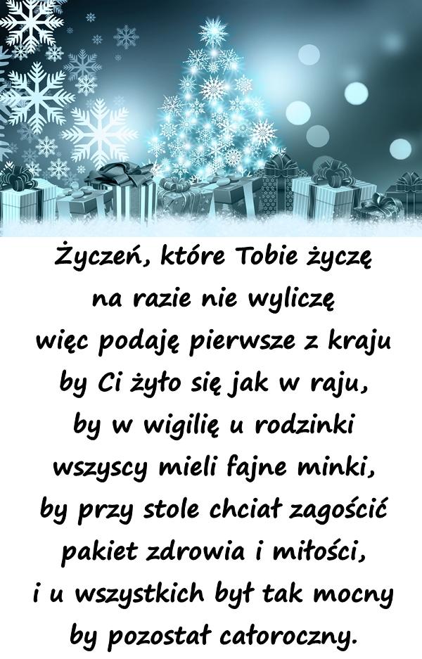 Życzeń, które Tobie życzę na razie nie wyliczę więc podaję pierwsze z kraju by Ci żyło się jak w raju, by w wigilię u rodzinki wszyscy mieli fajne minki, by przy stole chciał zagościć pakiet zdrowia i miłości, i u wszystkich był tak mocny by pozostał całoroczny.