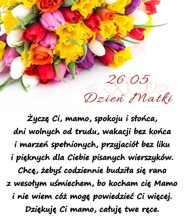 Życzę Ci, mamo, spokoju i słońca, dni wolnych od trudu, wakacji bez końca i marzeń spełnionych, przyjaciół bez liku i pięknych dla Ciebie pisanych wierszyków. Chcę, żebyś codziennie budziła się rano z wesołym uśmiechem, bo kocham cię Mamo i nie wiem cóż mogę powiedzieć Ci więcej. Dziękuję Ci mamo, całuję twe ręce.